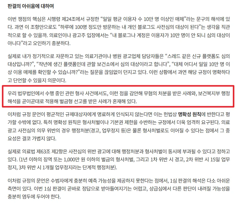 특히 ‘일일 이용자 수 10만 명 이상 플랫폼’이라는 기준은 개별 병원이나 개원병원 블로그의 영향력을 제재하기 위한 잣대라기보다는, 건전한 의료광고 분위기를 조성하기 위한 행정 기준으로 이해될 필요가 있다.