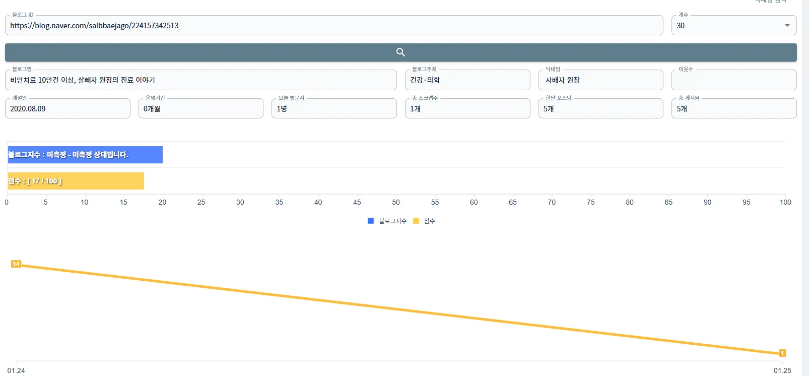 그 시점에 글이 존재하지 않던 블로그는 아예 지수 자체가 표시되지 않는 경우도 많죠.