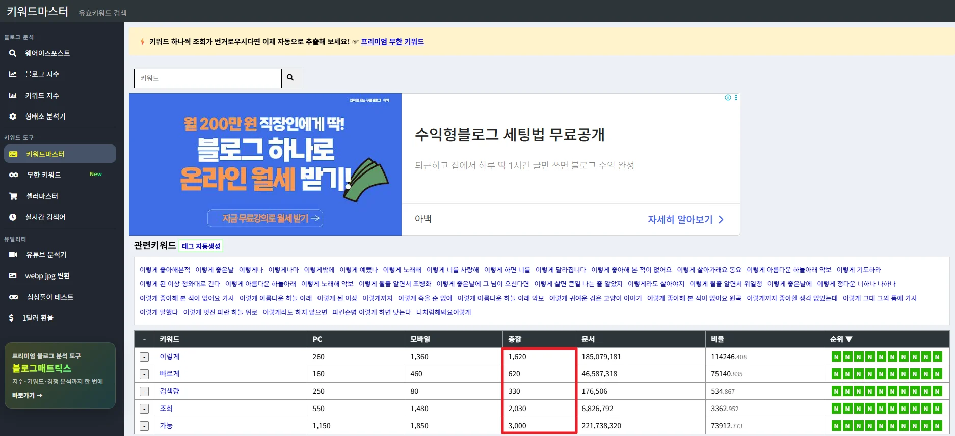 그래서 키워드마스터는 무료 툴이지만,
