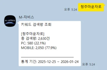 카카오톡 채널을 추가한 뒤, 채팅창에 키워드를 입력하면 해당 키워드의 모바일 / PC 검색량을 즉시 알려주는 챗봇 형태로 작동합니다.