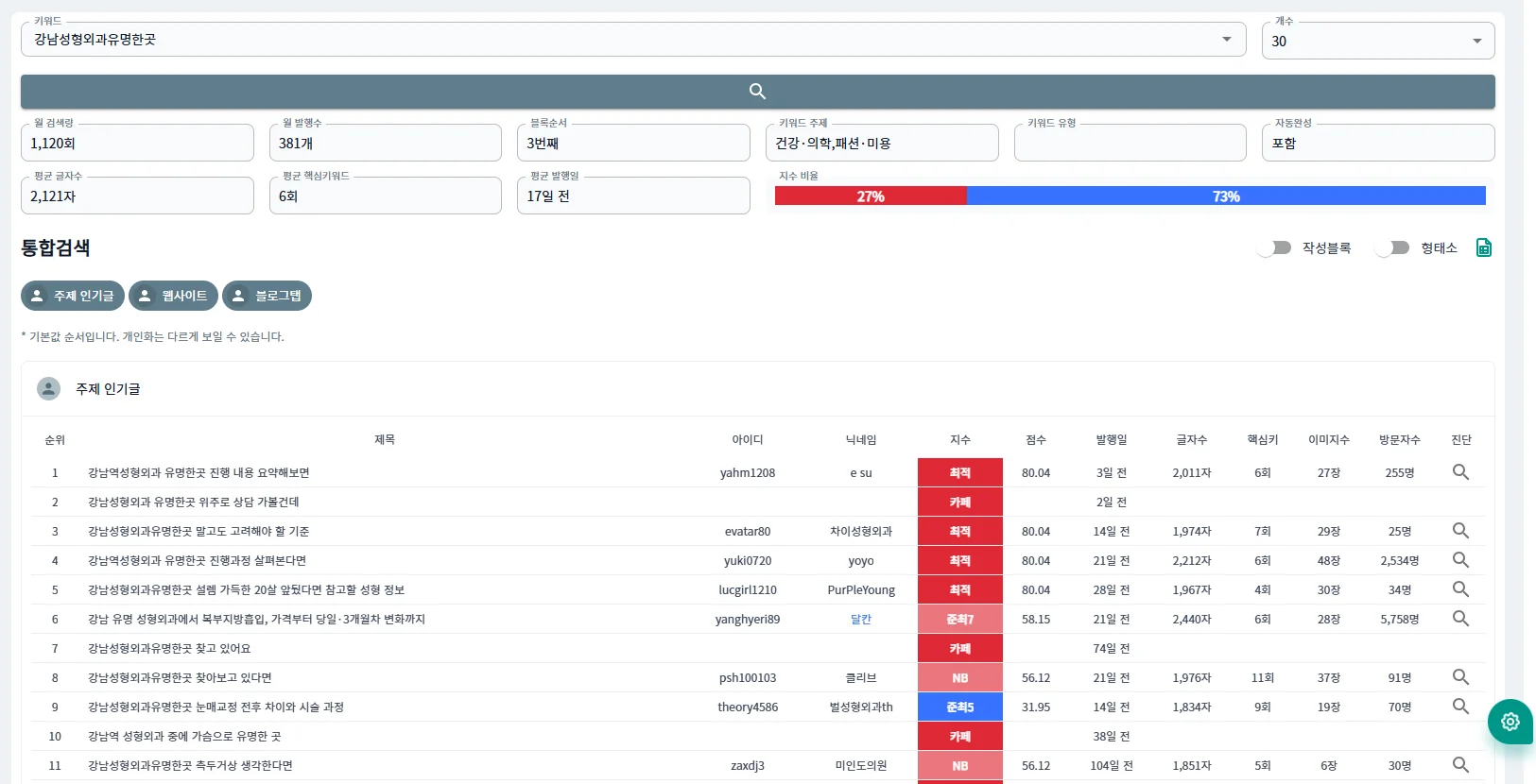 이 툴의 가장 큰 장점은 단순합니다. 이미 상위 노출된 블로그들의 지수가 그대로 보인다는 것이죠.